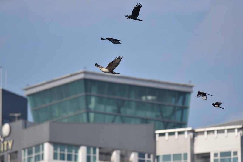 | ▲ 까마귀에 쫓기는 큰말똥가리(가운데) [대전환경운동연합 제공. 재판매 및 DB 금지] |