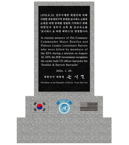 "In eternal memory of JSA Company Commander Major Bonifas and Platoon Leader Lieutenant Barrett who were killed by members of the KPA during a mission on Aug. 18, 1976, the ROK Government recognizes the newly built US officer barracks the 'Bonifas & Barrett Barracks,'" the memorial inscribed with Yoon's handwritten signature showed.