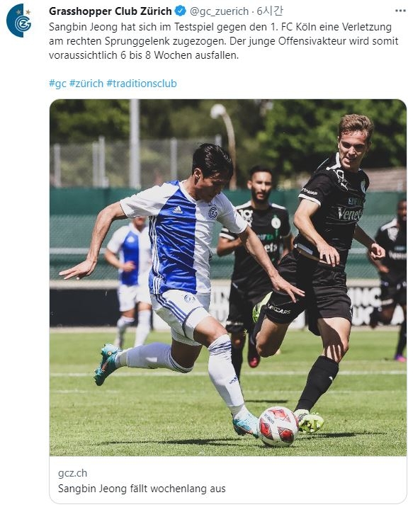 스위스 그라스호퍼 클럽 취리히는 12일(이하 한국시간) 구단 홈페이지를 통해 "정상빈이 쾰른과 친선경기에서 오른쪽 발목을 다쳤다. 자기공명영상(MRI) 검사 결과 발목 측면 인대 파열과 중족골 관절 염좌 진단을 받았다"며 "6∼8주 동안 전력에서 이탈할 것으로 보인다"고 전했다.