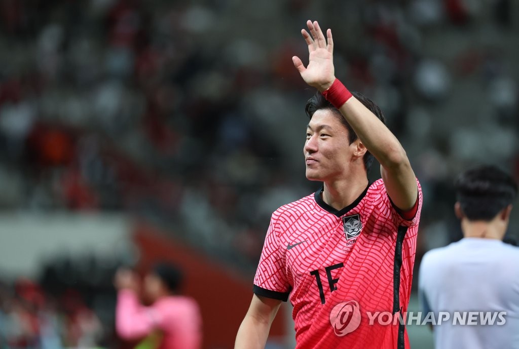 ▲ 관중들에게 인사하는 황의조 (서울=연합뉴스) 김인철 기자 = 지난 6월 14일 서울 마포구 서울월드컵경기장에서 열린 남자 축구 국가대표팀 친선경기 한국 대 이집트 경기에서 4-1로 승리한 대한민국의 황의조가 경기 종료 후 관중들에게 인사하고 있다. 2022.6.14 yatoya@yna.co.kr