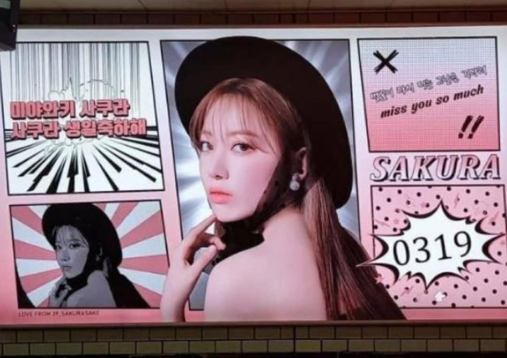걸그룹 아이즈원 출신 일본인 미야와키 사쿠라의 생일을 축하하며 중국 팬들이 1일 지하철 삼성역 광고판에 광고를 올렸는데, 여기에 욱일기를 연상시키는 배경이 포함됐다. 미야와키의 사진과 오는 19일 생일을 축하한다는 메시지 뒤로 욱일기 문양의 이미지가 보였다.