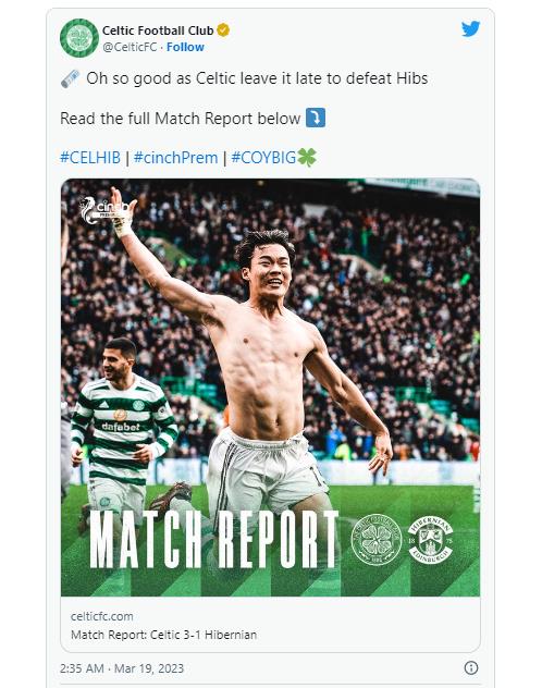| ▲ 오현규의 득점 및 팀 승리 소식을 전한 셀틱. [셀틱 구단 트위터. 재판매 및 DB 금지] |