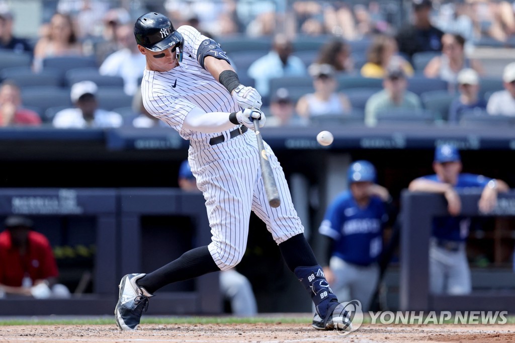 저지는 31일(한국시간) 미국 뉴욕 양키스타디움에서 캔자스시티 로열스와 치른 2022 미국프로야구 메이저리그(MLB) 홈경기에 2번 지명 타자로 출전해 2-0으로 앞선 2회 우중간 펜스를 직선타로 넘어가는 투런 아치를 그렸다.