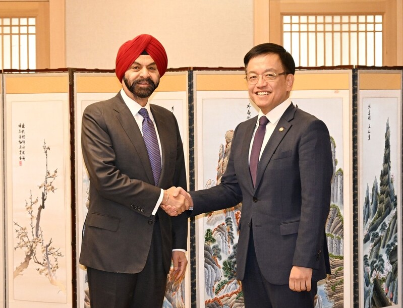 During the meeting, Choi and Banga discussed ways to boost cooperation between South Korea and the international entity on digital technology, global development aid via South Korea's official development assistance (ODA) programs and various other economic issues, according to officials of Seoul's finance ministry.