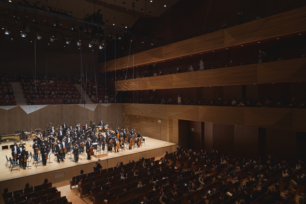 (통영=연합뉴스) 임동근 기자 = 지난 25일 저녁 통영국제음악당. 공연이 시작되자 심상치 않은 사건이 발생할 것처럼 음악이 질주한다. 이어 타악기는 강력하게, 관악기는 신비롭게, 현악기는 장엄하게 저마다의 소리로 대화를 주고받는다. 무대가 마치 악기들이 뛰어노는 놀이터 같다.