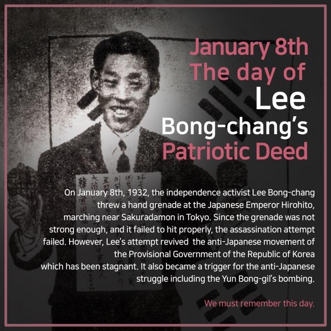 카드뉴스에는 "1932년 1월 8일, 이봉창 의사는 경시청 앞을 지나가는 일왕 히로히토를 향해 수류탄을 던졌다. 수류탄의 위력이 약했고 제대로 명중하지 못해 의거는 실패로 끝이 났지만, 그의 의거는 침체했던 대한민국 임시정부의 항일운동이 되살아나는 계기가 됐다"는 내용이 담겼다.