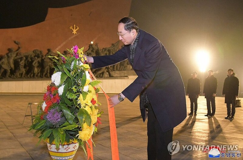 | ▲ This photo, carried by North Korea's official Korean Central News Agency on Jan. 26, 2024, shows Chinese Vice Foreign Minister Sun Weidong laying a wreath at the statues of North Korea's late founder Kim Il-sung and former leader Kim Jong-il in Pyongyang the previous day. (For Use Only in the Republic of Korea. No Redistribution) (Yonhap) |