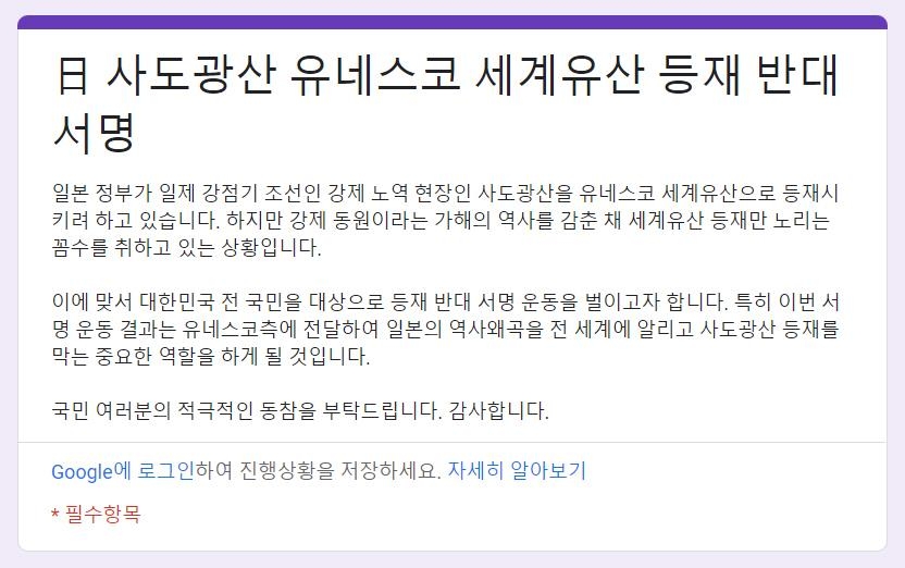 | ▲ 일본 사도광산 유네스코 세계유산 등재 반대 서명 운동 [서경덕 교수 제공] |