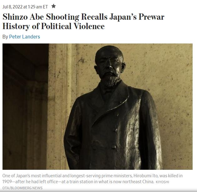 WSJ는 '아베 신조 총격 사건이 일본의 전쟁 전 정치폭력 역사를 상기시킨다'라는 제목의 기사에서 "일본에서 가장 영향력 있고 가장 오래 재임한 총리 중 한 명인 이토 히로부미는 1909년 중국 북동부에 위치한 기차역에서 살해됐다. 암살자는 일본의 한반도 식민지화에 반대했던 한국인 민족주의자였다"라고 썼다.