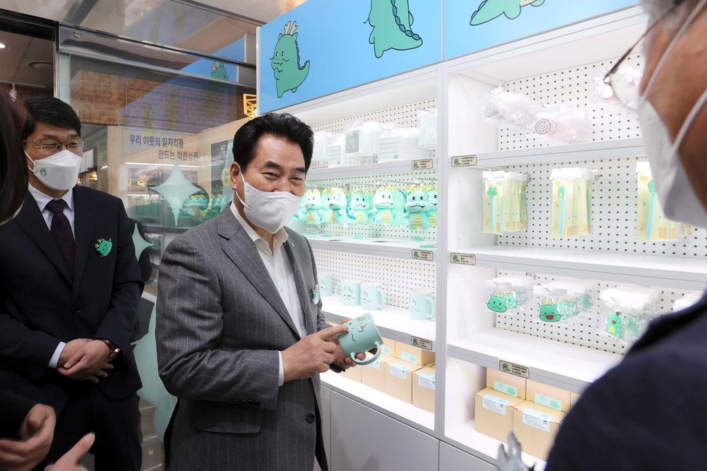 | ▲ 용인시 '조아용' 굿즈 판매점 기흥역에 개소 (용인=연합뉴스) 백군기 경기 용인시장(왼쪽 두 번째)이 4일 용인경전철 기흥역 환승센터 내에 문을 연 '조아용in스토어'를 방문해 시 캐릭터 '조아용' 굿즈를 살펴보고 있다. 2022.4.4 [용인시 제공. 재판매 및 DB 금지] photo@yna.co.kr |