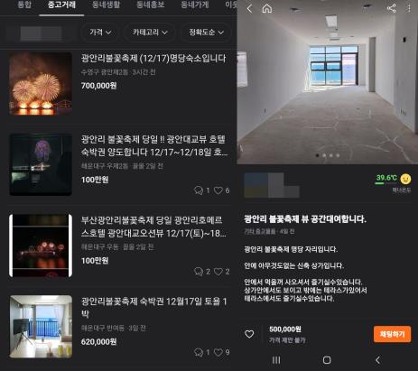 3일 당근마켓 등 중고거래 플랫폼에는 부산 불꽃축제가 열리는 17일 광안리 호텔 숙박권이 50만~100만원에 판매되고 있었다.