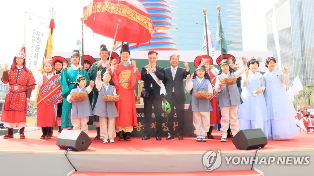 ▲ 하동세계차엑스포 조직위, '왕의 차' 진상 의례 (서울=연합뉴스) 하동세계차엑스포 조직위원회(이하 조직위)가 행사 개최 한 달여를 남기고 1일 서울 청계광장에서 임금님에게 지리산 명품 하동차(茶)를 올리는 '왕의 차' 진상 의례를 재현했다. 조직위는 배우 최불암 씨를 2023 하동세계차엑스포 명예 홍보대사로 위촉했다. 2023.4.1 [경남도 제공. 재판매 및 DB 금지] photo@yna.co.kr