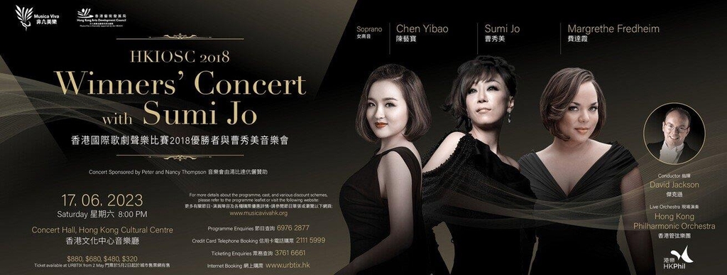 조수미는 17일 오후 8시 홍콩 문화센터에서 열리는 'HKIOSC 2018 위너스 콘서트 위드 수미 조'에서 2018년 제1회 홍콩 국제 성악콩쿠르 수상자 2명과 합동 공연을 한다.
