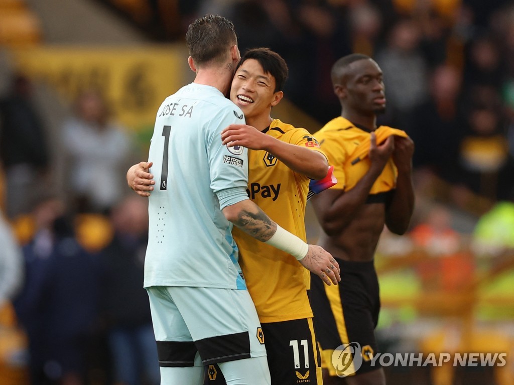 | ▲ 골키퍼 조세 사(왼쪽)와 기쁨을 나누는 황희찬(가운데). [로이터=연합뉴스] |