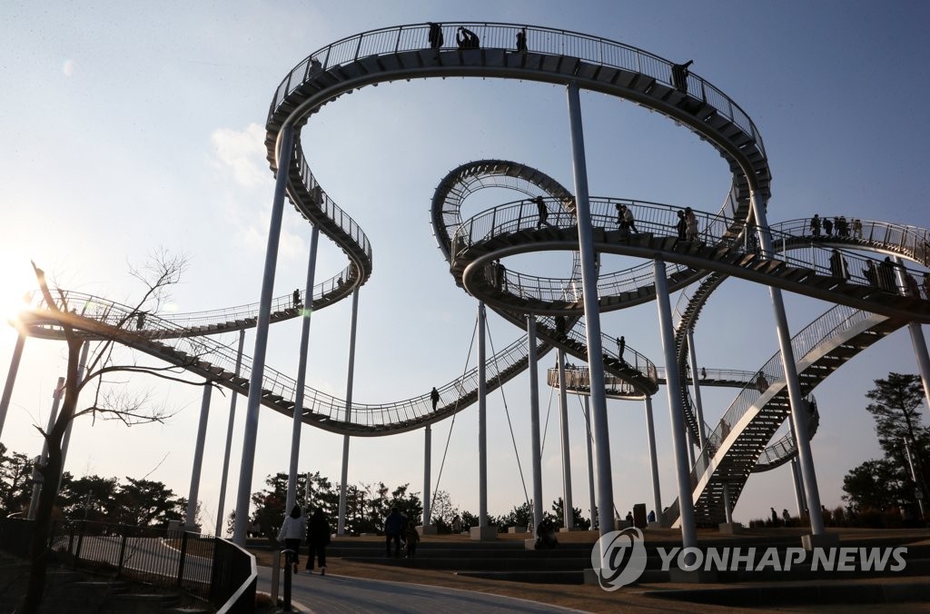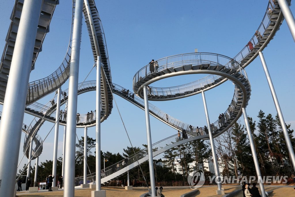 | ▲ 관광객 몰린 체험형 조형물 (포항=연합뉴스) 손대성 기자 = 20일 경북 포항시 북구 환호공원에 있는 체험형 조형물 '스페이스워크'에 시민과 관광객이 올라가 체험하고 있다. 스페이스워크는 포스코가 2019년 4월부터 4천925㎡ 부지에 117억 원을 들여 가로 60m, 세로 57m, 높이 25m 규모로 건립해 포항시에 기부한 국내 최대 규모 체험형 조형물로 지난달 18일 준공됐다. 2021.12.20 sds123@yna.co.kr |