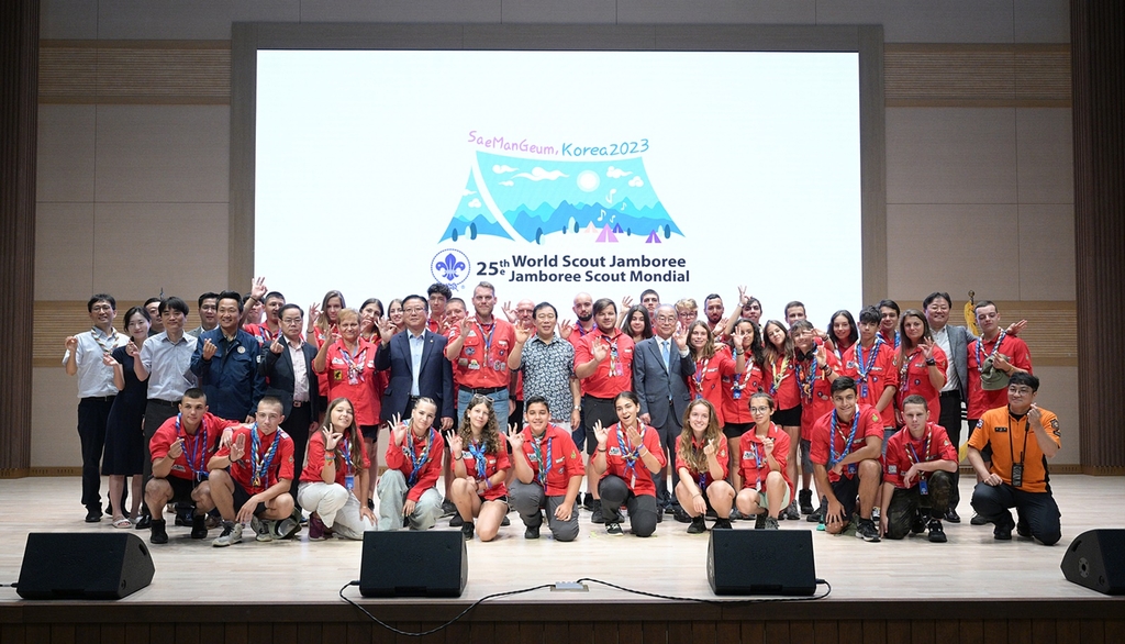| ▲ 불가리아 스카우트 대표단 환송 행사 (세종=연합뉴스) 12일 세종시 장군면 한국영상대학교 국제관 앞에서 열린 제25회 새만금 세계스카우트잼버리 불가리아 대표단 환송 행사에서 최민호 시장과 불가리아 대표단이 기념사진을 찍고 있다. [세종시 제공. 재판매 및 DB 금지] |