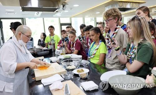 | ▲ 사찰음식 배우는 불가리아 대원들 (세종=연합뉴스) 이은파 기자 = 지난 8일 세종시를 찾은 제25회 세계스카우트잼버리 불가리아 대원들이 조계종 총무원이 운영하는 세종전통문화체험관을 찾아 사찰음식 조리법을 배우고 있다. 2023.8.8 sw21@yna.co.kr |