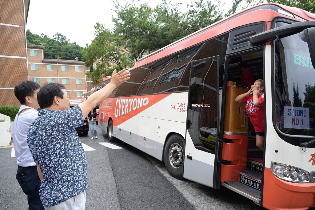| ▲ 불가리아 스카우트 대표단 환송 (세종=연합뉴스) 12일 세종시 장군면 한국영상대학교 국제관 앞에서 열린 제25회 새만금 세계스카우트잼버리 불가리아 대표단 환송 행사에서 최민호 세종시장(오른쪽)이 관광버스에 탑승한 불가리아 대표단에 손을 들어 인사하고 있다. [세종시 제공. 재판매 및 DB 금지] |