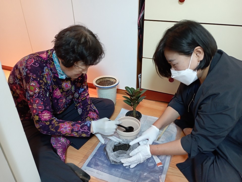 원예치료 사업은 노인 맞춤돌봄 생활지원사가 독거노인 가정을 방문해 함께 공기정화식물 등을 심고 돌보는 법을 가르치고 천연방향제 포푸리 만들기와 식물 일지 작성을 지도하는 방식으로 운영된다.