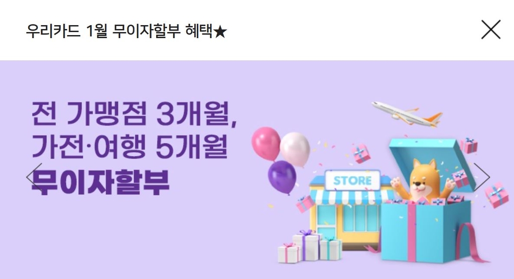 22일 카드업계에 따르면 우리카드는 1월 들어 개인 신용카드로 5만원 이상 결제 때 전 가맹점에서 2∼3개월 무이자할부를 선택할 수 있는 이벤트를 진행 중이다.