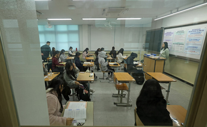 Test-takers sit at the venue of their exam at a high school in the central city of Daejeon on Nov. 13, 2025, for the state-administered scholastic aptitude test, a key deciding factor in college entrance. Some 554,000 students nationwide are taking the test to enter college in the spring semester that begins in March. (Yonhap)