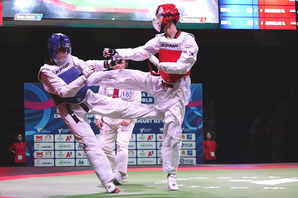 | ▲ 남자 57㎏급에서 금메달을 딴 김건우(오른쪽)의 결승 경기 모습. [세계태권도연맹 제공. 재판매 및 DB 금지] |
