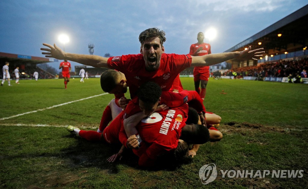 | ▲ 샘 오스틴의 동점골에 환호하는 키더민스터 선수들 [로이터=연합뉴스] |