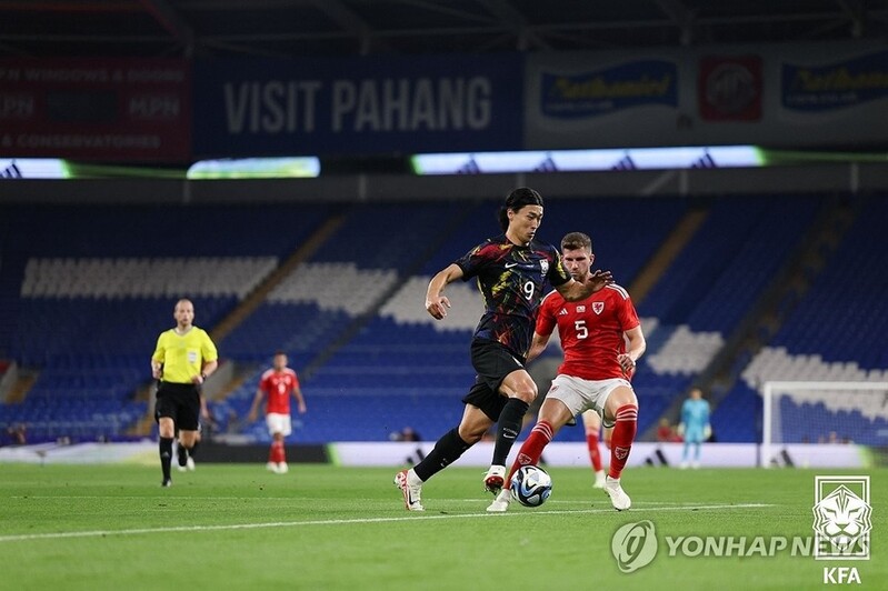 | ▲ 돌파하는 조규성 (서울=연합뉴스) 위르겐 클린스만(독일) 감독이 이끄는 한국 남자 축구 대표팀은 8일(한국시간) 영국 웨일스의 카디프 시티 스타디움에서 열린 웨일스와 평가전에서 0-0 무승부를 거뒀다. 사진은 돌파하는 조규성의 모습. 2023.9.8 [대한축구협회 제공. 재판매 및 DB 금지] photo@yna.co.kr |