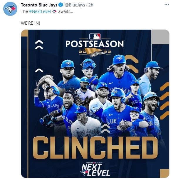 | ▲ 토론토, 포스트시즌 진출 확정 [토론토 블루제이스 트위터 캡처. 재판매 및 DB금지] |