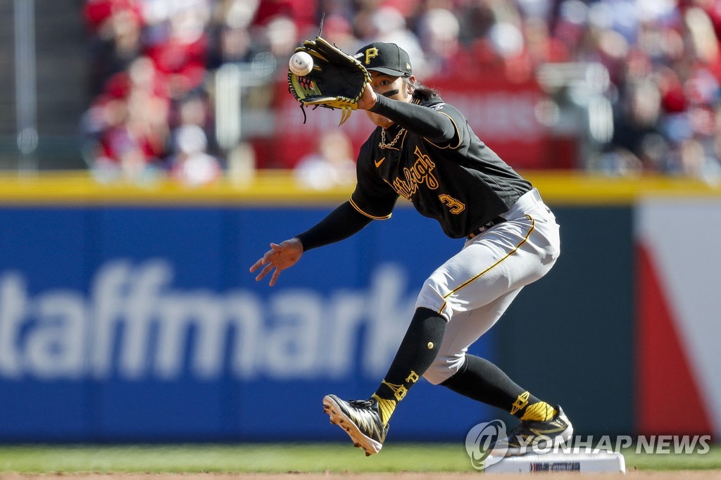 | ▲ 다재다능한 배지환 (신시내티 USA투데이스포츠/로이터=연합뉴스) 피츠버그 파이리츠 배지환이 31일(한국시간) 미국 오하이오주 신시내티의 그레이트 아메리칸 볼파크에서 열린 2023 미국 메이저리그 신시내티 레즈와의 개막전에서 2루수로 선발 출전해 수비하고 있다. |