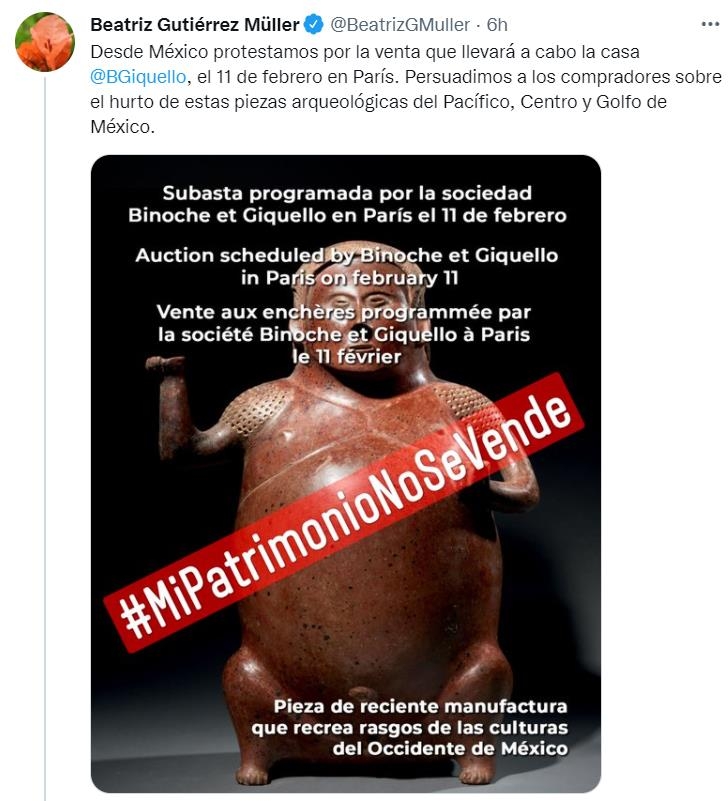 | ▲ 프랑스 경매업체의 중남미 유물 경매 비판하는 멕시코 영부인 트윗 [멕시코 영부인 트위터 캡처. 재판매 및 DB 금지] |