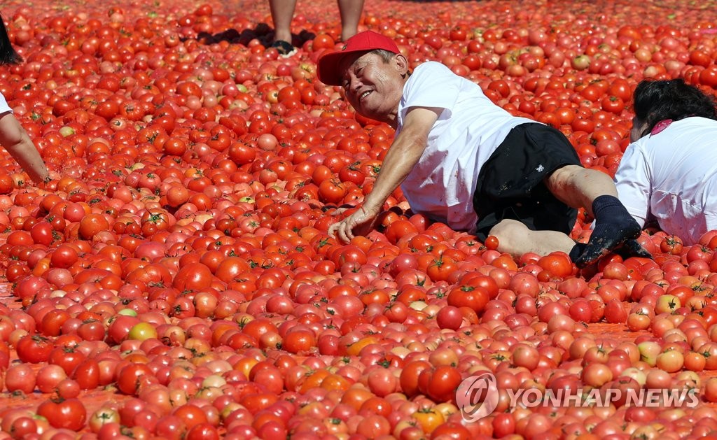 매회 1천여명 안팎의 관광객들이 토마토의 붉은 바다에 몸을 던지는 이색 체험을 했다.