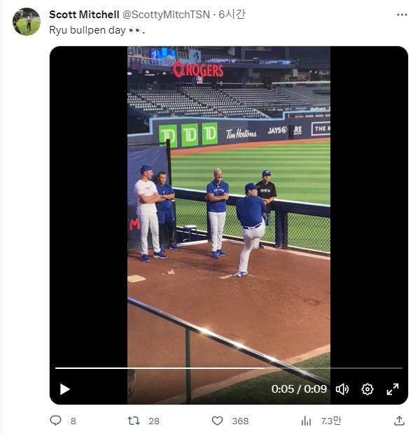 | ▲ 불펜 투구하는 류현진 토론토 블루제이스 류현진이 30일(한국시간) 캐나다 온타리오주 토론토 로저스센터에서 존 슈나이더 감독 등 관계자들이 보는 앞에서 불펜 투구를 하고 있다. [리처드 그리핀 소셜미디어 캡처. 재배포 및 DB 금지] |