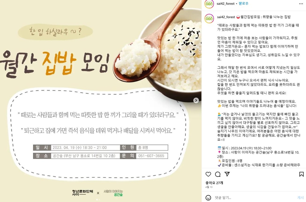 ▲ 월간 집밥 모임 사회관계망서비스 계시길 [공간숲 인스타그램(@sai42_forest) 갈무리. 재판매 및 DB 금지]