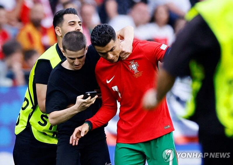 | ▲ 그라운드에 난입해 크리스티아누 호날두의 목을 잡고 사진을 찍으려는 팬. [로이터=연합뉴스] |