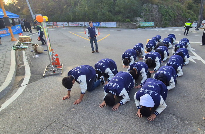 A group of underclassmen bows to seniors taking the state-administered scholastic aptitude test, a key deciding factor in college entrance, as they root for them and wish them good luck on the test at a high school in Sokcho, Gangwon Province, northeastern South Korea, on Nov. 13, 2025. Some 554,000 students nationwide are taking the test to enter college in the spring semester that begins in March. (Yonhap)