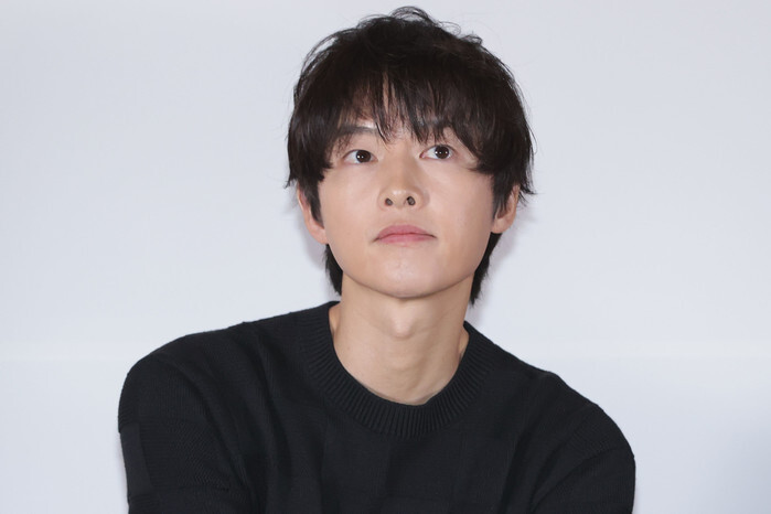 South Korean actor Song Joong-ki, who stars in the new movie "Bogota: City of the Lost," listens to reporters' questions during an event in Seoul on Dec. 19, 2024, to promote the movie, set to hit local screens in South Korea on Dec. 31. (Yonhap)