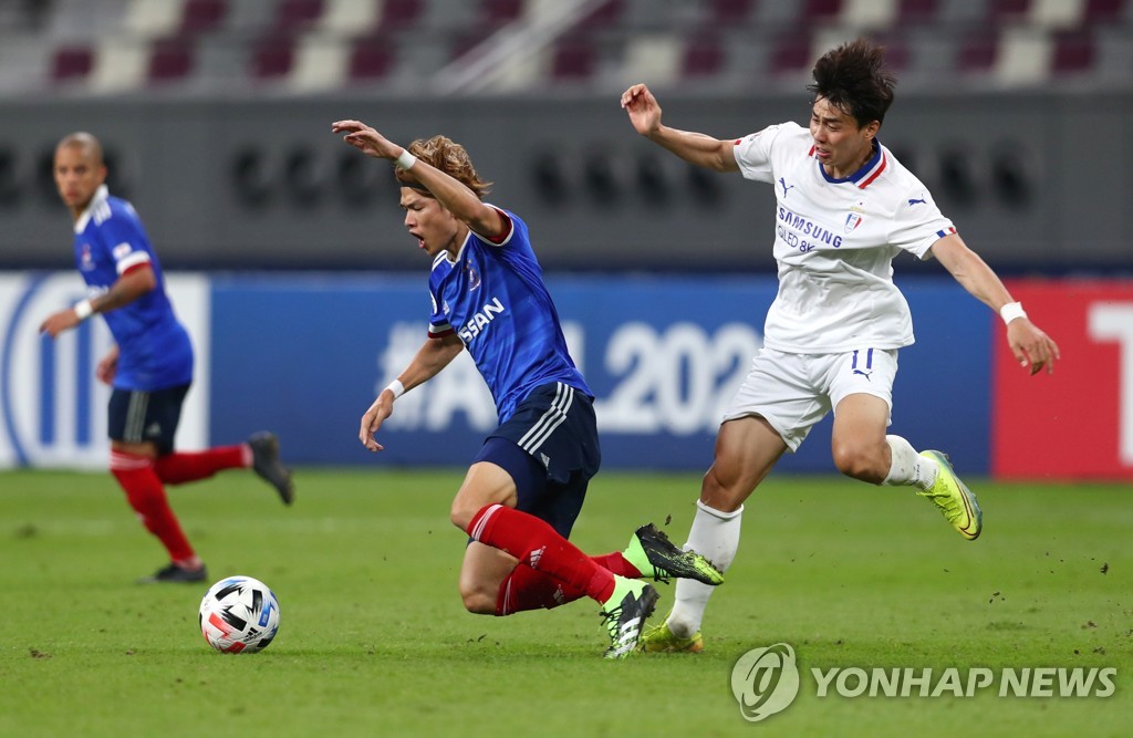 | ▲ In this Reuters photo, Lim Sang-hyub of Suwon Samsung Bluewings (R) is in action against Takahiro Ogihara of Yokohama F. Marinos in the round of 16 at the Asian Football Confederation Champions League at Khalifa International Stadium in Doha on Dec. 7, 2020. (Yonhap) |