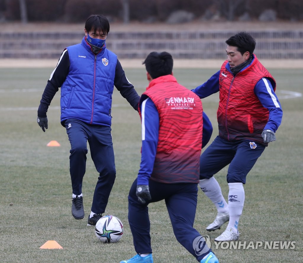 | ▲ Hong Myung-bo (L), head coach of Ulsan Hyundai FC, controls the ball during a practice session at Gangdong Football Stadium in Ulsan, 415 kilometers southeast of Seoul, on Jan. 11, 2021. (Yonhap) |