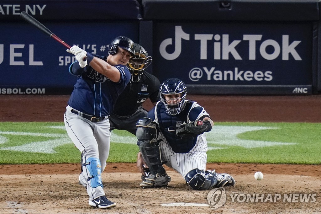 | ▲ In this Associated Press photo, Choi Ji-man of the Tampa Bay Rays (L) hits an RBI single against the New York Yankees in the top of the seventh inning of a Major League Baseball regular season game at Yankee Stadium in New York. (Yonhap) |