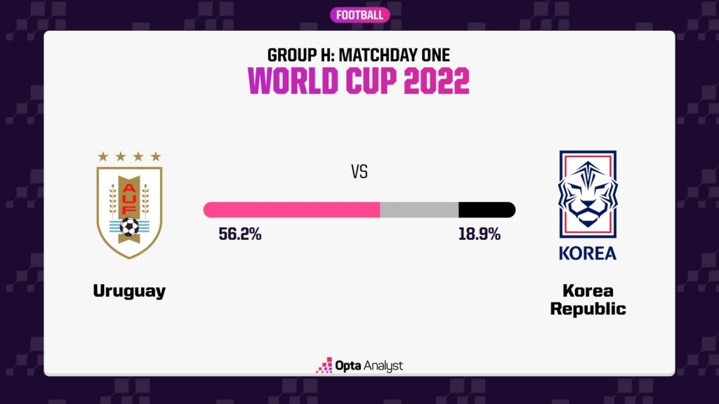 옵타는 "(안와 골절상을 당해) 마스크를 쓰고 뛸 손흥민이 정상적으로 경기를 치른다고 해도 우루과이가 승리할 가능성이 크다"며 "우루과이는 역대 월드컵에서 아시아 국가와 4차례 맞붙어 모두 승리했다"고 과거 사례도 들었다.
