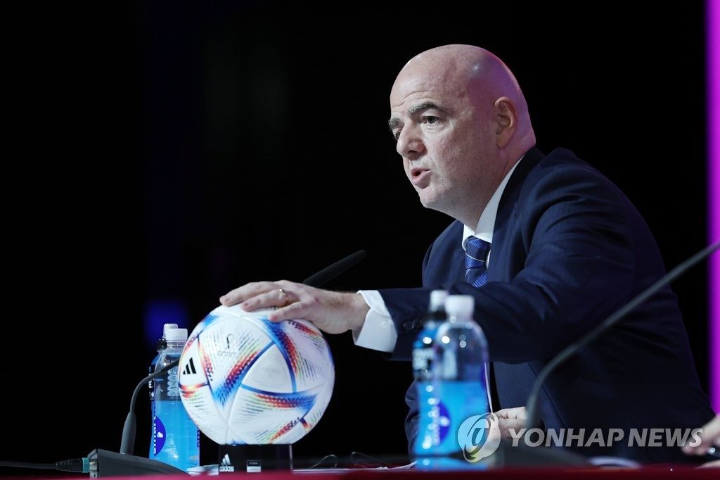 | ▲ 공인구 '알 릴라' 만지는 인판티노 FIFA 회장 (도하=연합뉴스) 김주성 기자 = 잔니 인판티노 국제축구연맹(FIFA) 회장이 2022 카타르 월드컵 개막을 하루 앞둔 지난달 19일 오전(현지시간) 카타르 도하의 메인미디어센터(MMC)에서 열린 기자회견에서 답변 도중 공인구 '알 릴라'를 만지고 있다. 2022.11.19 utzza@yna.co.kr |
