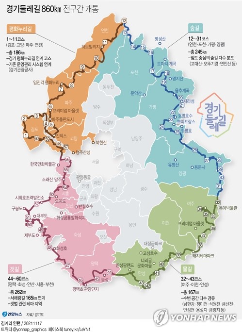 | ▲ [그래픽] 경기둘레길 860㎞ 전구간 개통 (서울=연합뉴스) 경기도 외곽 860㎞를 연결하는 '경기 둘레길' 전 구간이 개통했다.2021.11.17 [연합뉴스 자료. 재판매 및 DB 금지] |