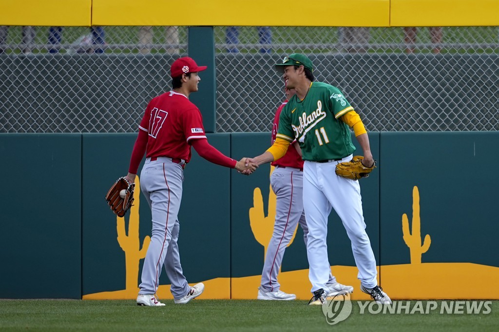 | ▲ 빅리그에서 만난 오타니와 후지나미 (메사 AP=연합뉴스) 동갑내기 오타니(왼쪽)와 후지나미가 1일(한국시간) 미국 애리조나주 메사 호호캄 스타디움에서 열린 2023 미국프로야구 메이저리그 시범경기서 선발 맞대결을 펼치기 전, 악수하고 있다. |