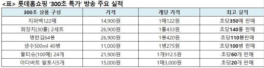 | ▲ [롯데홈쇼핑 300초 특가 방송 주요 실적] |