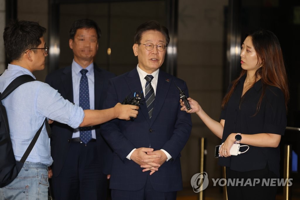 | ▲ Lee Jae-myung, leader of the main opposition Democratic Party, speaks to reporters on Aug. 18, 2023, in front of the Seoul Central District Prosecutors Office. (Yonhap) |