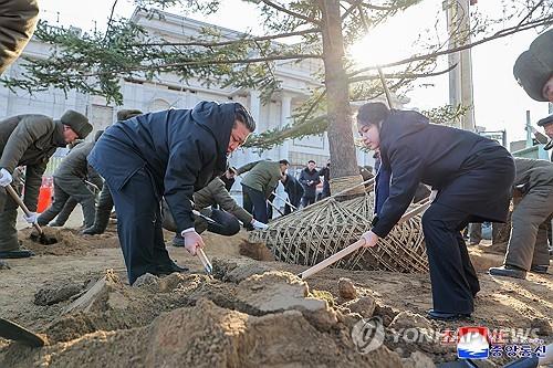 Images released by the North's state media showed Kim's wife, Ri Sol-ju, and daughter Ju-ae accompanied Kim at the event, with Ju-ae seen digging the ground along with her father in the tree planting.