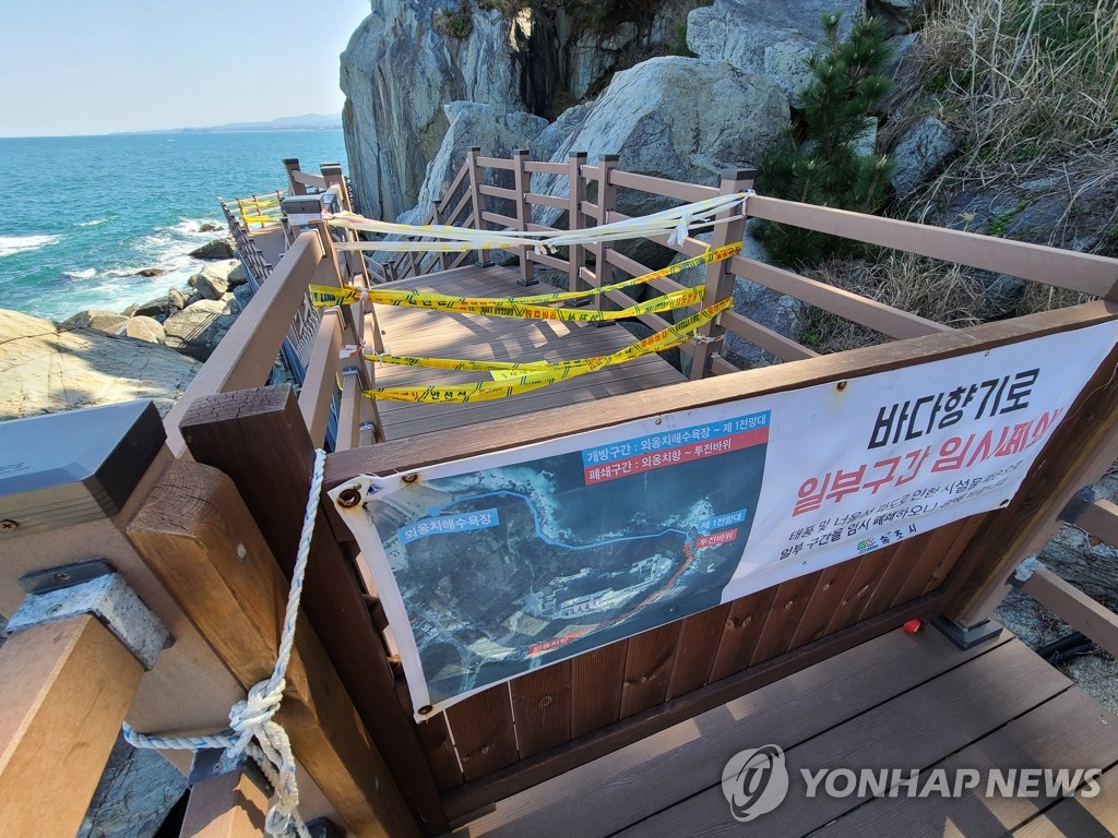 속초 외옹치 해안에 설치된 바다향기로의 경우 지난해 9월 태풍 하이선에 상당 부분이 부서져 전체 구간 가운데 절반 정도인 투전바위∼외옹치항 구간은 10개월째 통제 중이다.