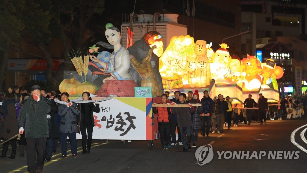 | ▲ 탐라국 입춘굿 전야제 (제주=연합뉴스) '2017 정유년 탐라국 입춘굿' 전야제에서 '춘등걸궁'이 진행되고 있다. 사진은 풍요의 신 '자청비'를 형상화한 제등을 앞세운 풍물패와 사람들이 거리 행진을 하는 모습. [연합뉴스 자료사진] |