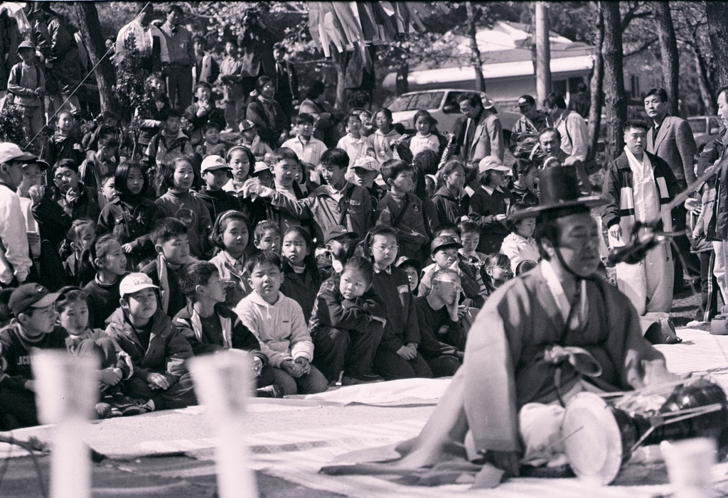 | ▲ 칠머리당영등굿 보는 초등학생들 (제주=연합뉴스) 지난 1999년 3월 제주시 건입동에서 제주동초등학교 학생들이 김윤수 심방('무당'을 뜻하는 제주어)이 시연하는 칠머리당영등굿을 지켜보고 있다. 2021.4.4 [강정효 전 제주 민예총 이사장 제공, 재판매 및 DB 금지] |